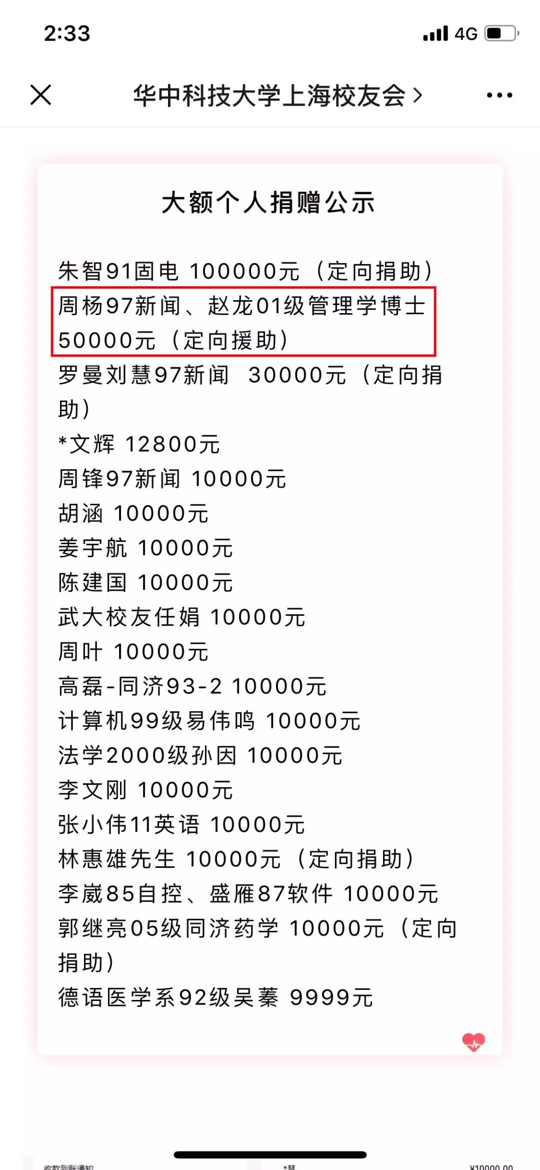 下圖為“華中科技大學上海校友會”公眾號文章“華中科技大學上海校友會“支援湖北”資金募集信息公開”部分截圖