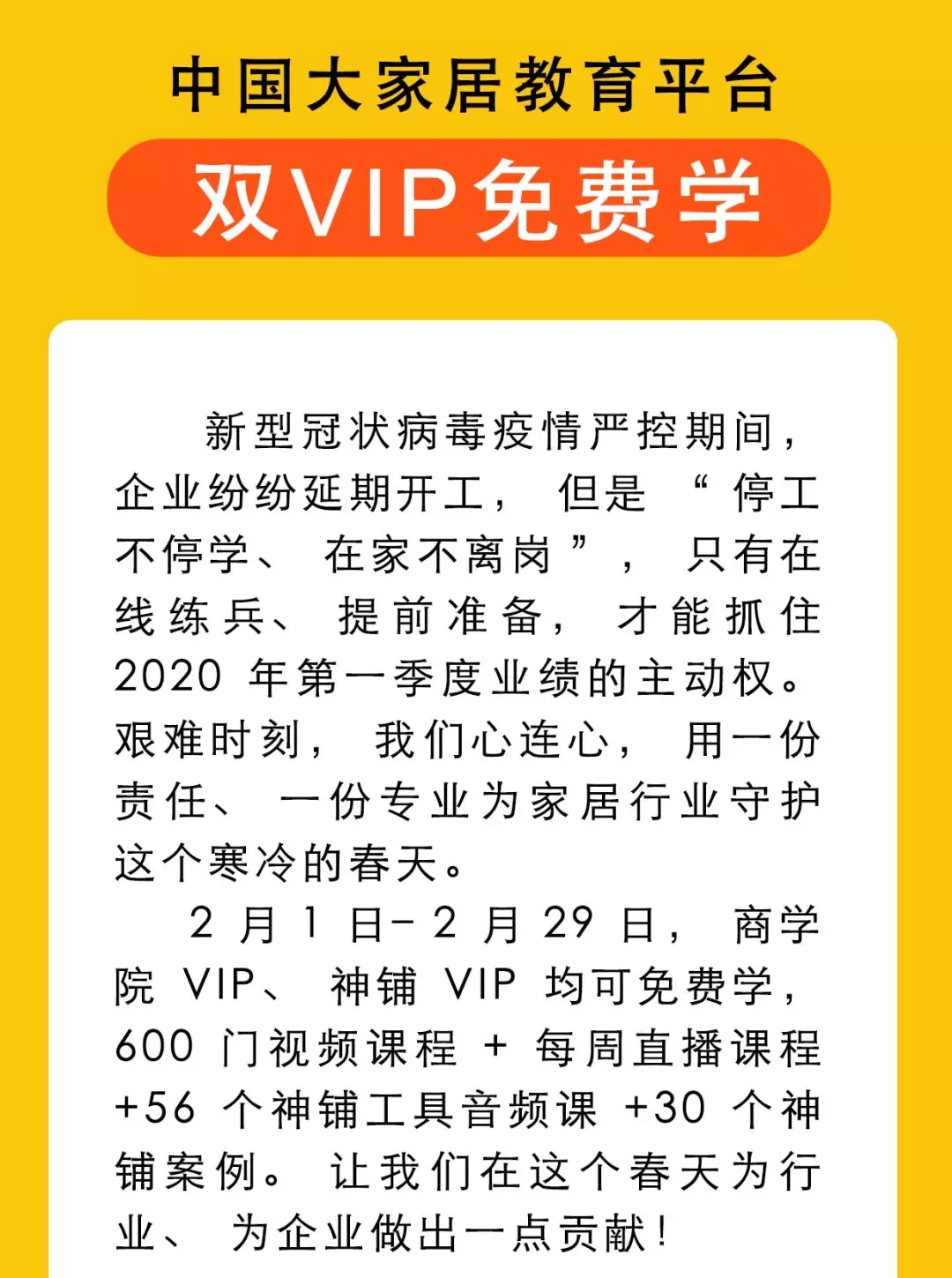 同時,我們倆想,除了捐贈,我們還可以在自己的專業和事業上做出更多努力,讓今日中國因為有國富縱橫、有魯班大學這群可愛的人而更加溫暖和有力!所以,今天與很多同仁商量后,我們共同決定“中國大家居教育平臺”開啟“免費學習月”,讓我們在這個2月為行業、為企業做出一點貢獻,抗擊疫情,在線練兵,挽救業績!